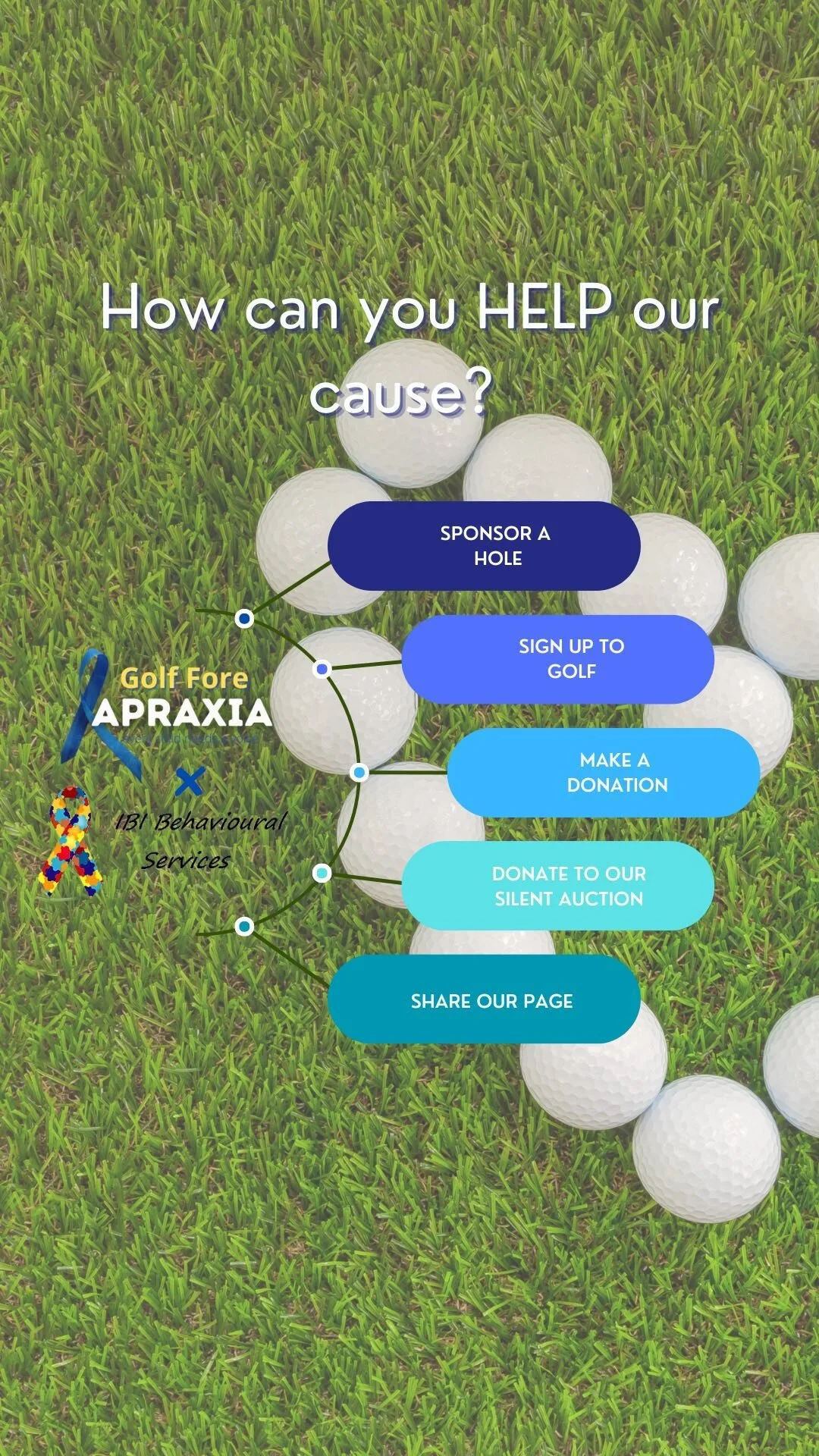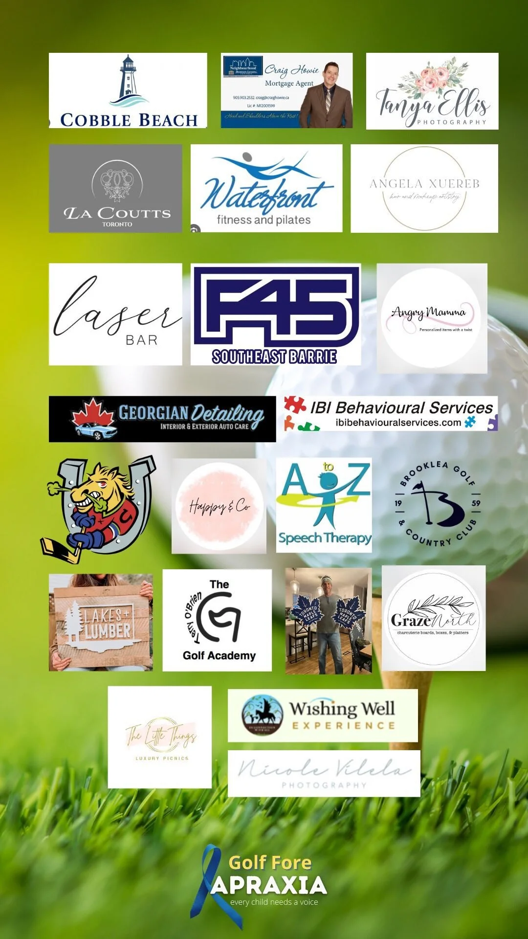 Invitation to save the date for September 20 at Allandale Golf Course featuring logos of IBI Behavioural Services, Unique Minds Academy, and APraxia, with a background of a boy golfing on the course.