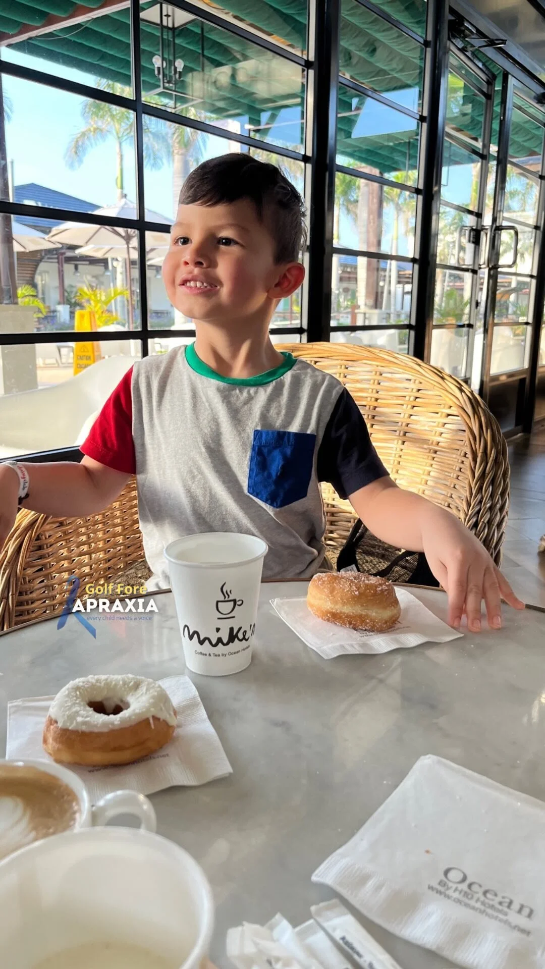 A young boy smiling, sitting on a beige couch, with a blue overlay on the image. Text on the image promotes communication for children with speech difficulties, stating that speaking doesn't always mean spoken words.