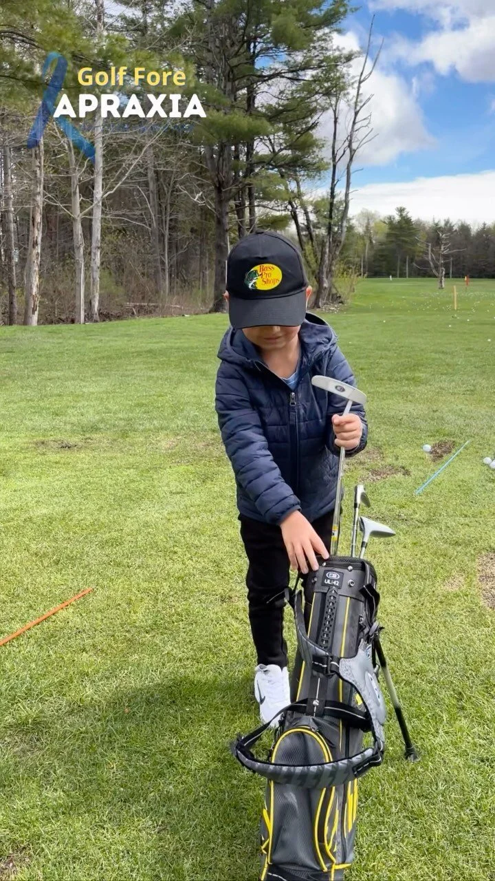Event flyer for golf tournament organized by APRAAXIA to support child advocacy, featuring background photos of people playing golf and socializing, with event details, date, time, location, and registration fee.